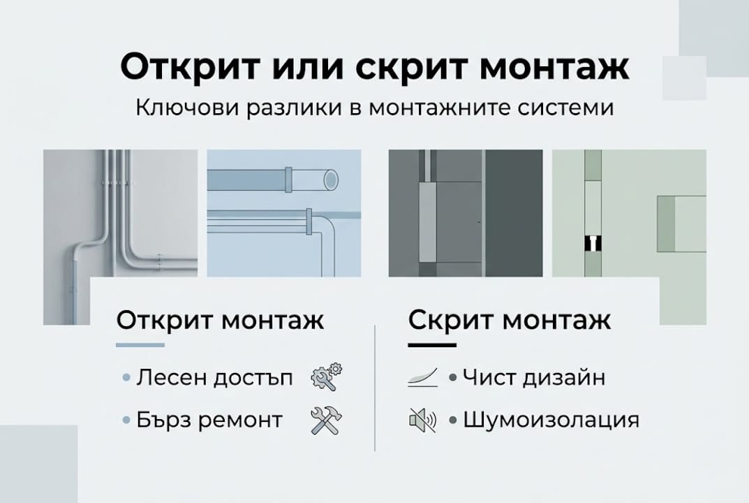 При скрития монтаж кабелите и тръбите се полагат в щроби (изрязани канали в стената), след което се замазват и покриват. Резултатът е чиста стена без видими елементи, но процесът е по-дълъг, по-скъп и при повреда изисква разкриване на стената. При открития монтаж всичко е на повърхността, закрепено с кабелни скоби, кабелни канали или декоративни кутии.